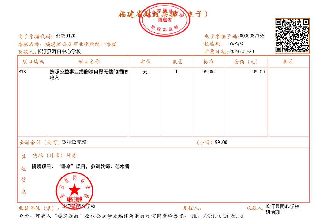慈善捐赠总额为:99.00元,捐赠发票公示如下: