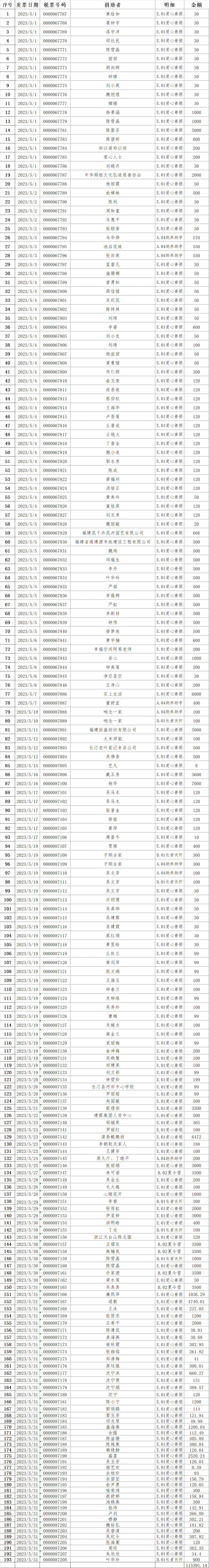 长汀县同心学校2023年05月捐赠公示如下: