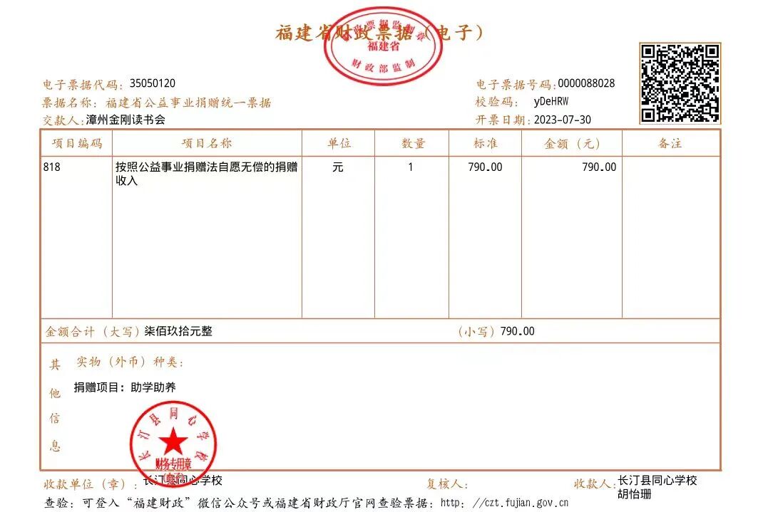 慈善捐赠总额为:790.00元,捐赠发票公示如下: