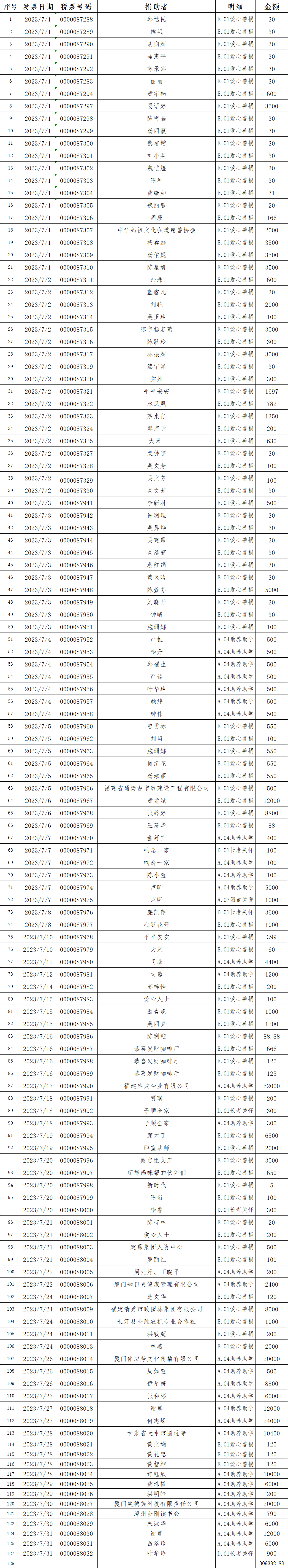 长汀县同心学校2023年07月捐赠公示如下:
