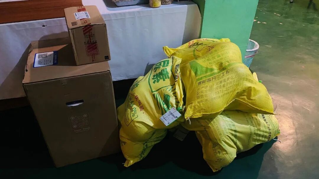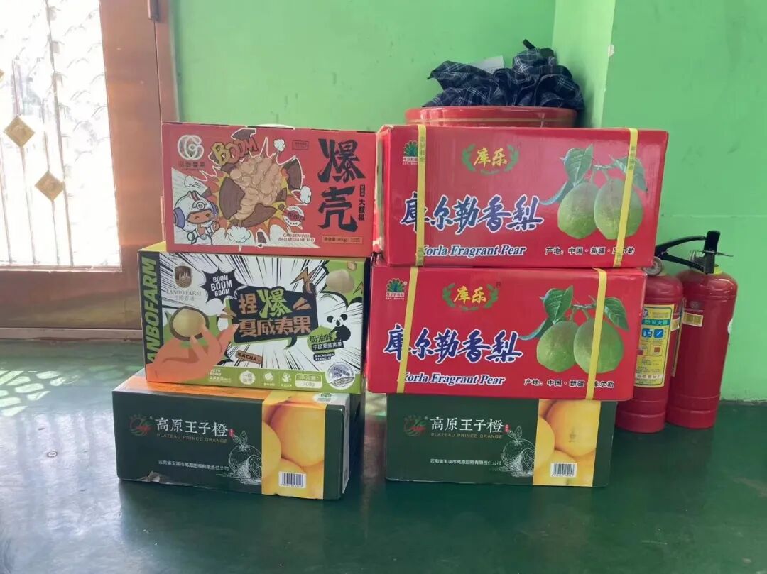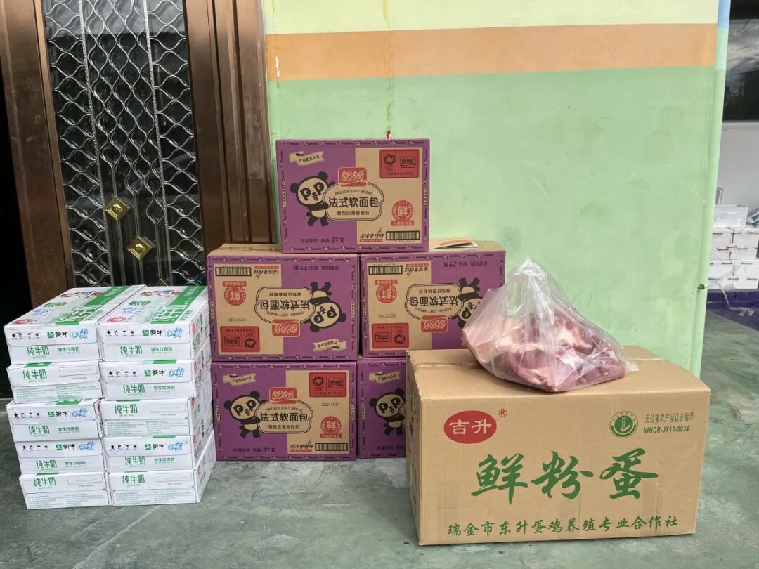 牛奶10箱、面包5箱、鸡蛋1箱、猪肉若干