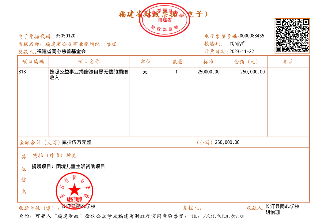 慈善捐赠总额为:250000.00元,捐赠发票公示如下: