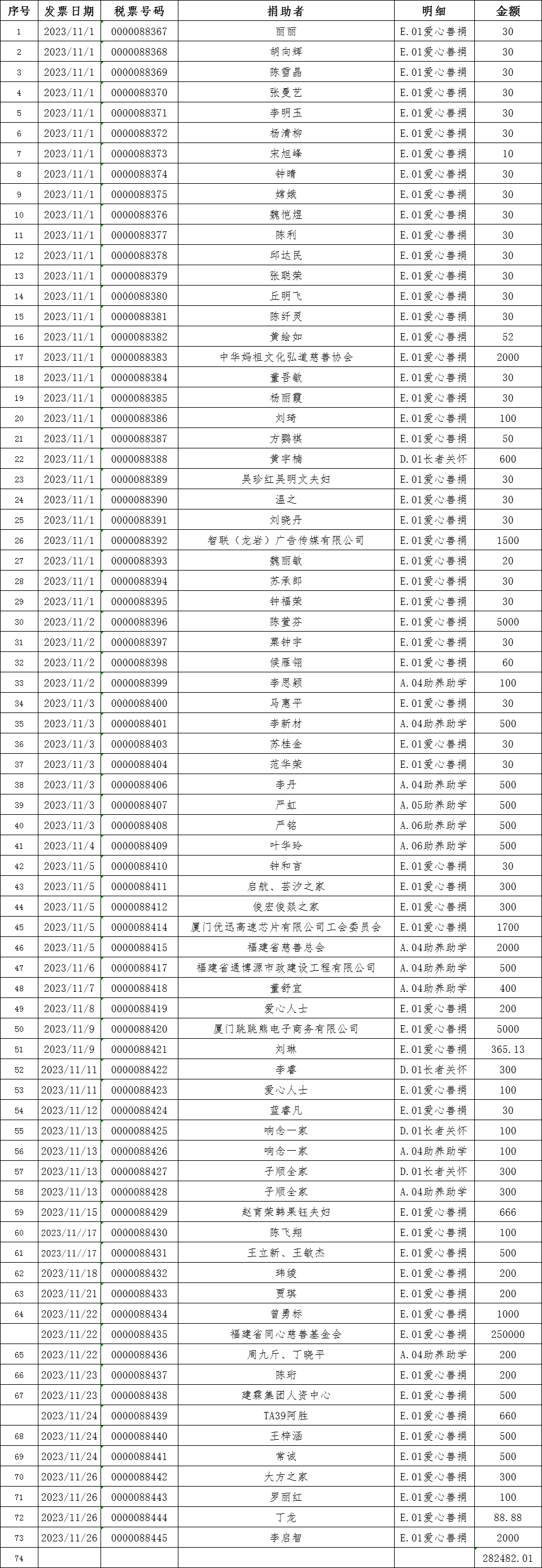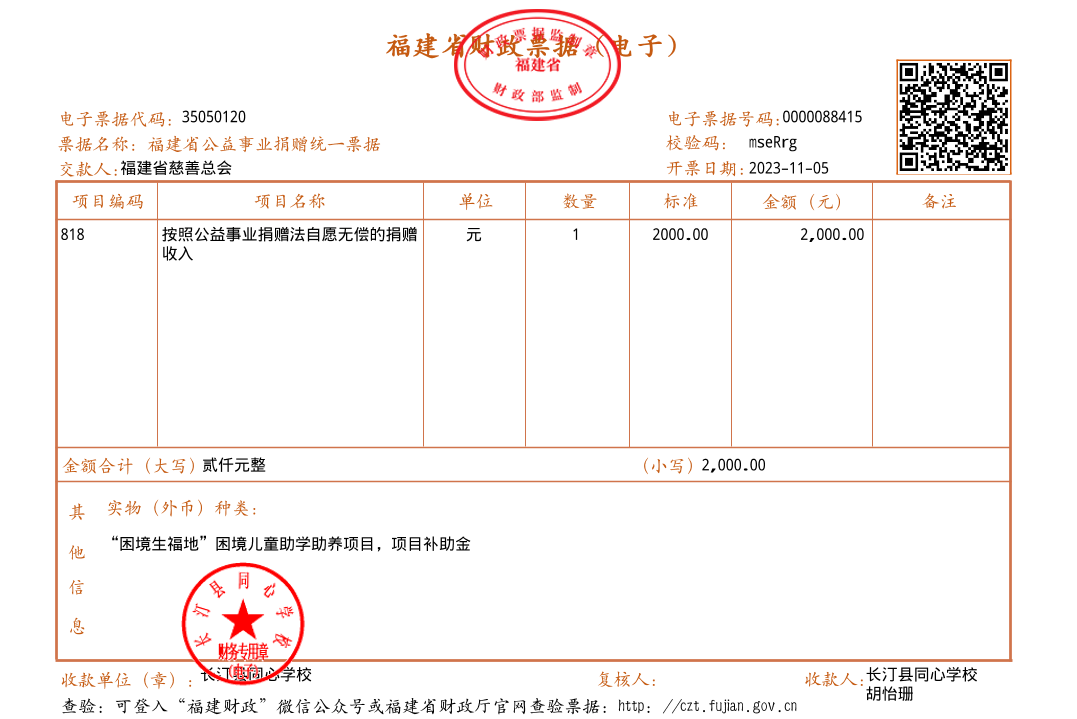 慈善捐赠总额为:2000.00元,捐赠发票公示如下: