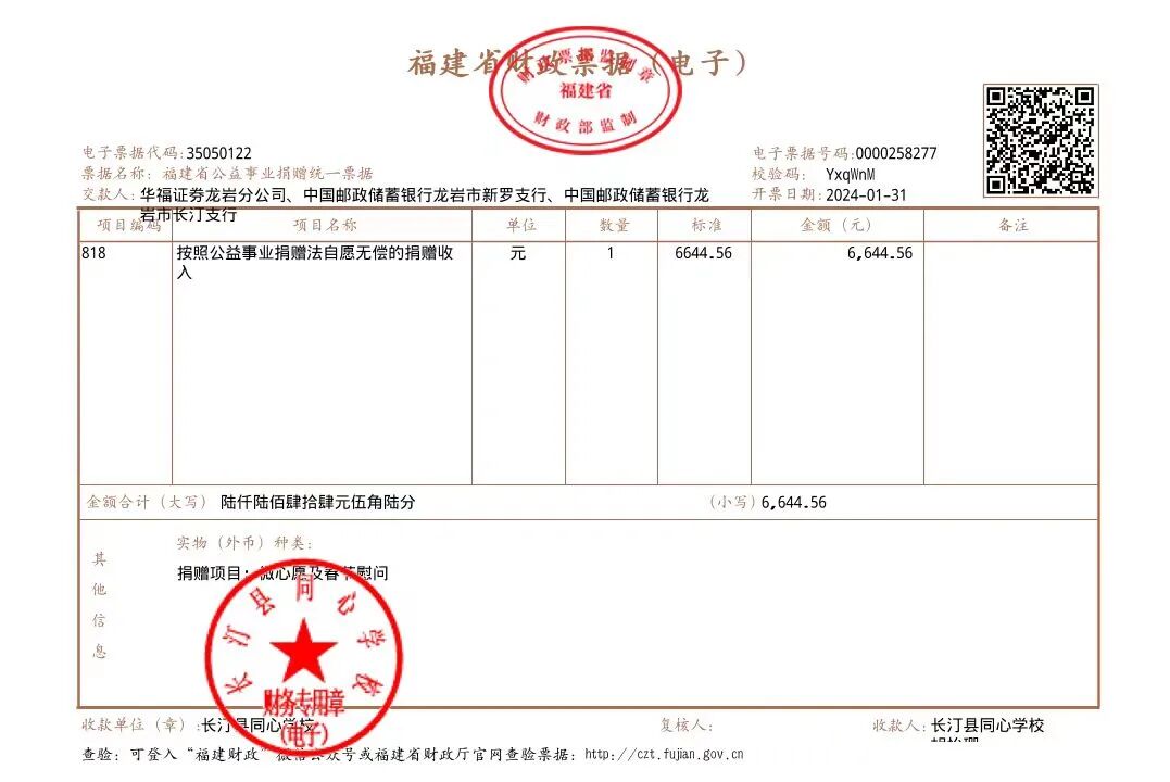 慈善捐赠总额为:6644.56元,捐赠发票公示如下: