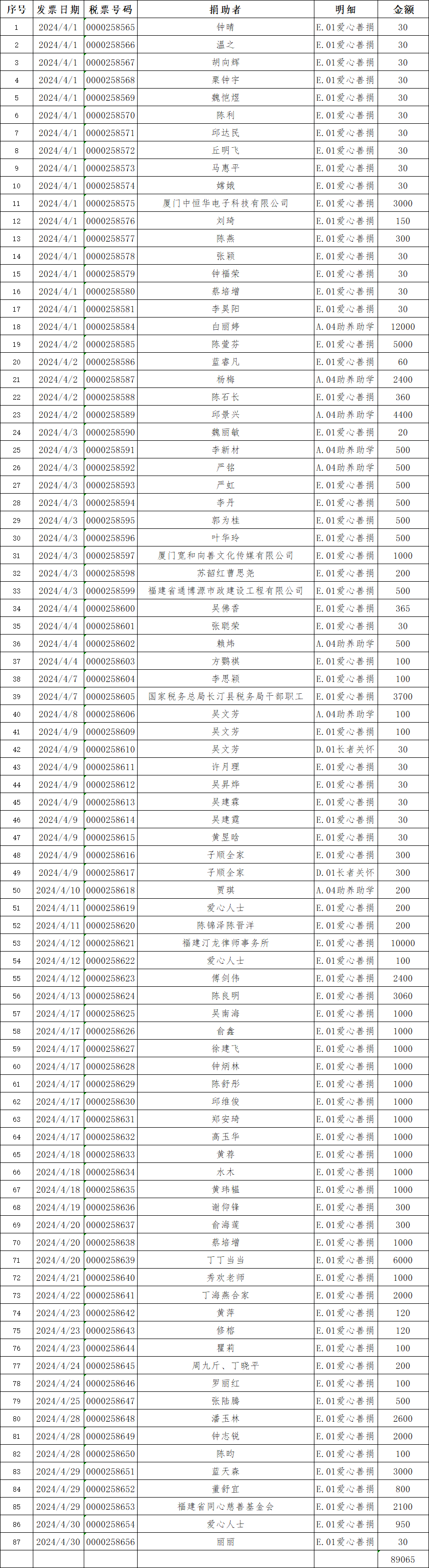 长汀县同心学校2024年04月捐赠公示如下: