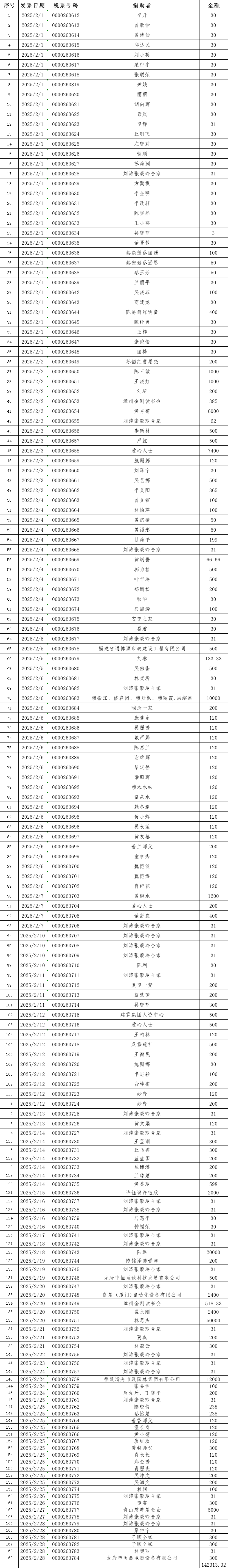 长汀县同心学校2025年02月捐赠公示如下: