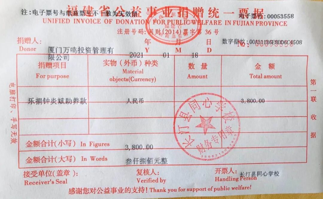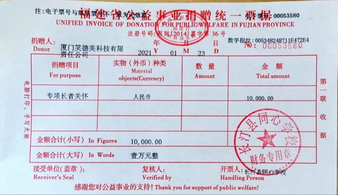 慈善捐赠总额为:10000.00元,捐赠发票公示如下:
