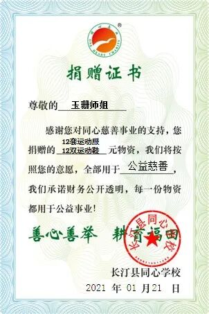 黄玉珊 捐赠12套运动服,12双运动鞋。