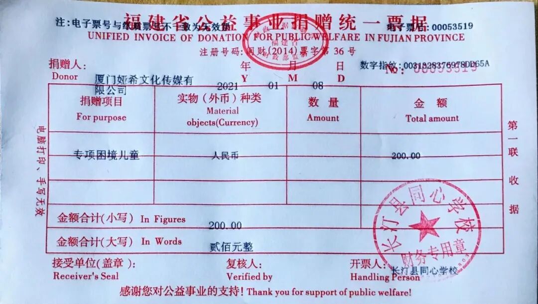 慈善捐赠总额为:200.00元,捐赠发票公示如下: