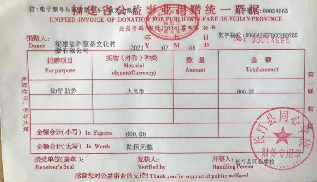 慈善捐赠总额为:600.00元,捐赠发票公示如下:
