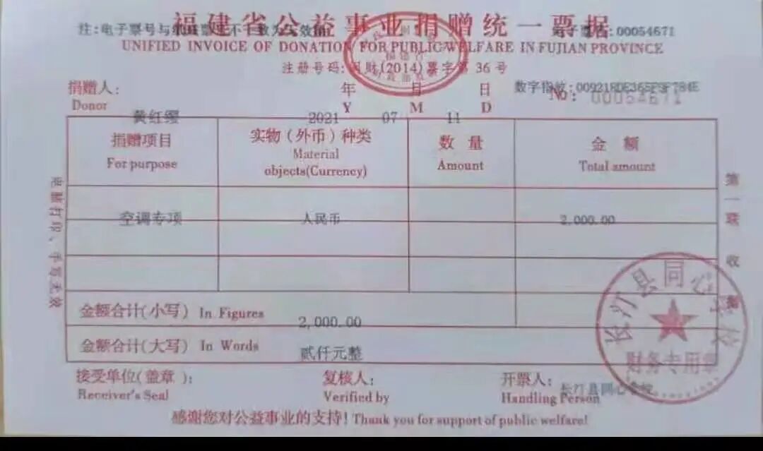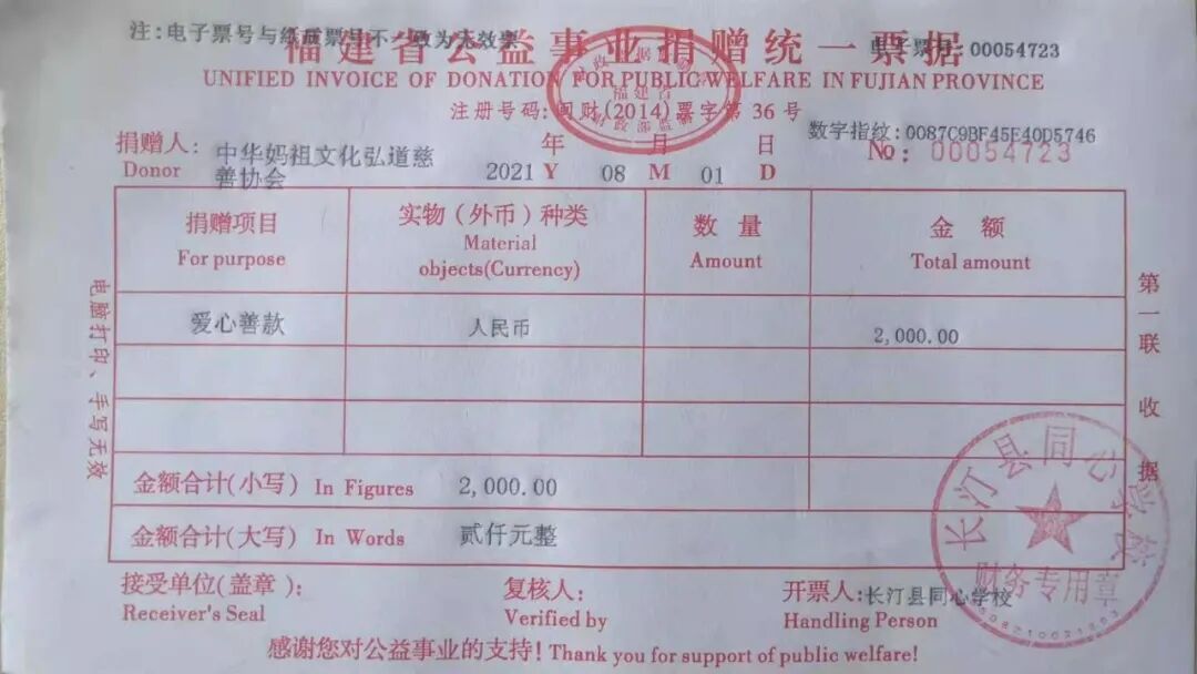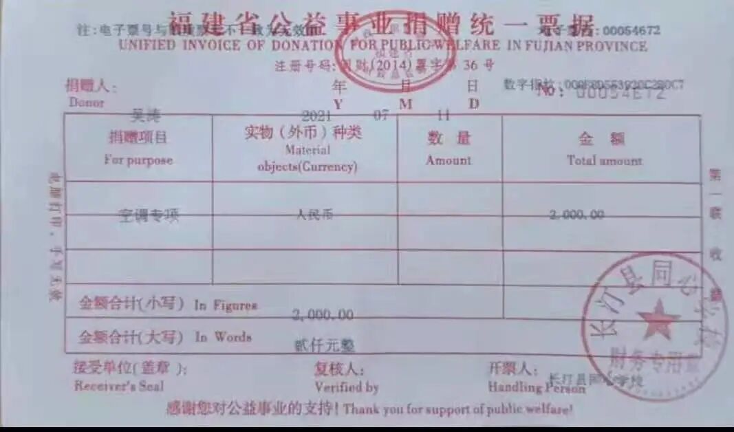 慈善捐赠总额为:2000.00元,捐赠发票公示如下: