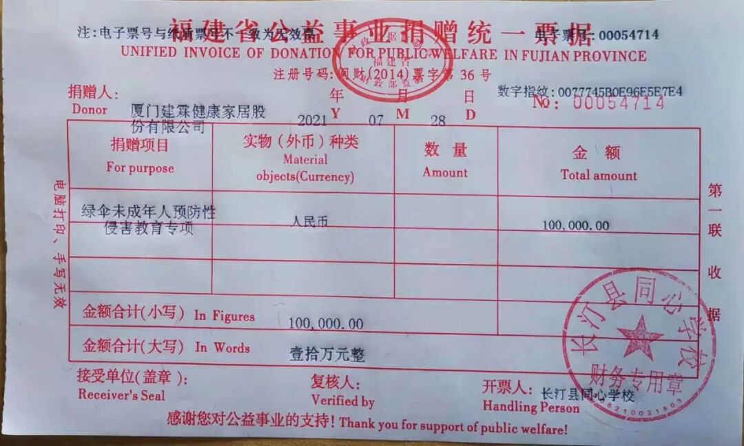 慈善捐赠总额为:100000.00元,捐赠发票公示如下: