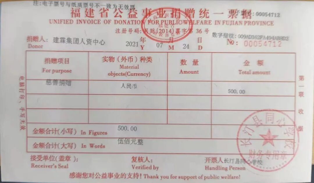 慈善捐赠总额为:500.00元,捐赠发票公示如下: