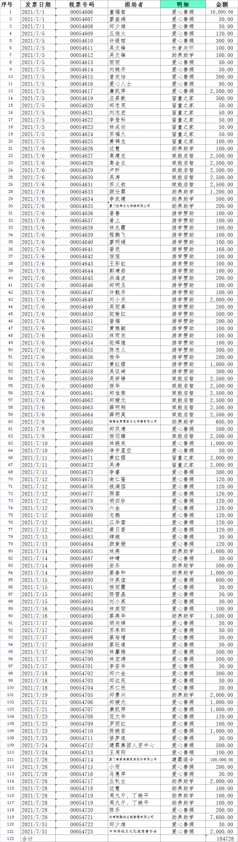 慈善捐赠总额为:650.00元,捐赠明细公示如下: