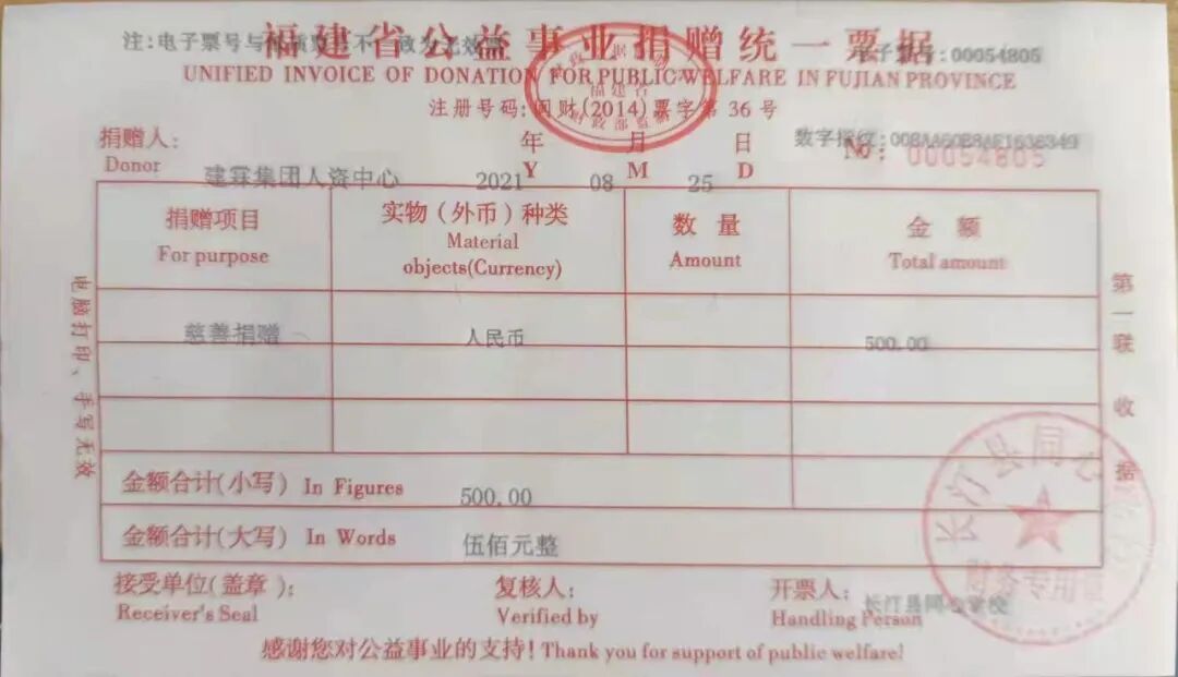 慈善捐赠总额为:500.00元,捐赠发票公示如下: