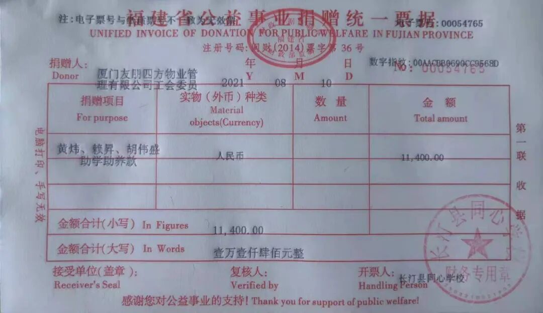 慈善捐赠总额为:11400.00元,捐赠发票公示如下: