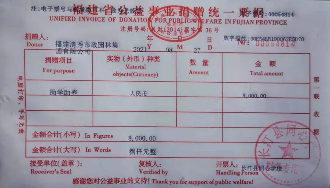 慈善捐赠总额为:8000.00元,捐赠发票公示如下: