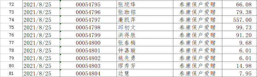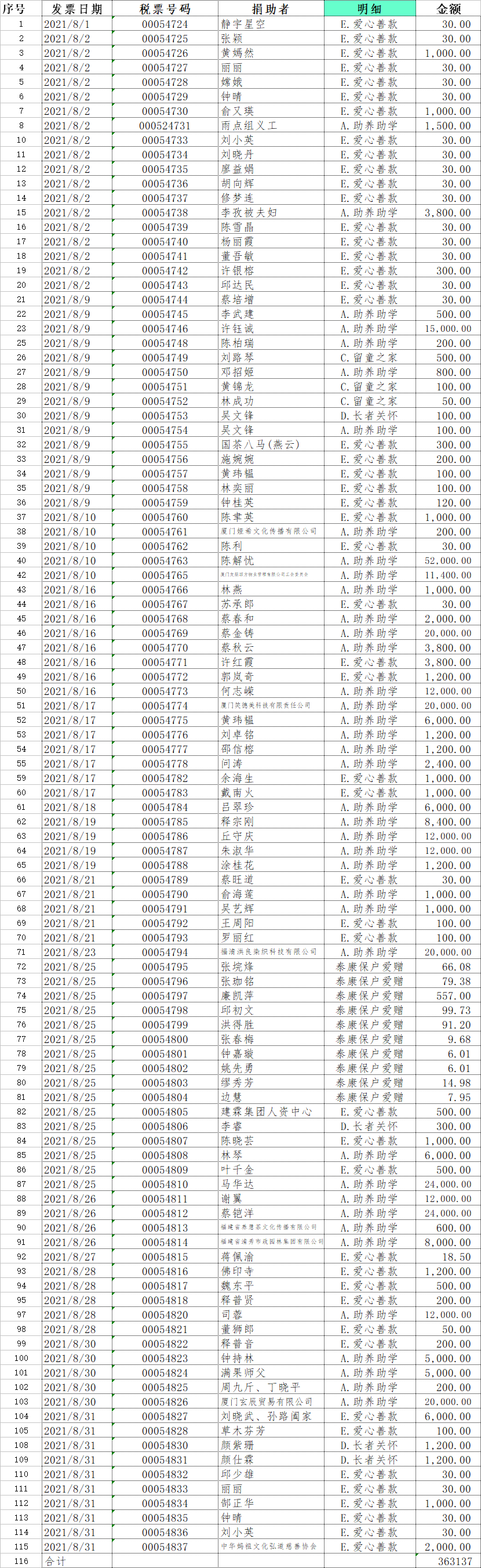 长汀县同心学校2021年8月捐赠公示如下: