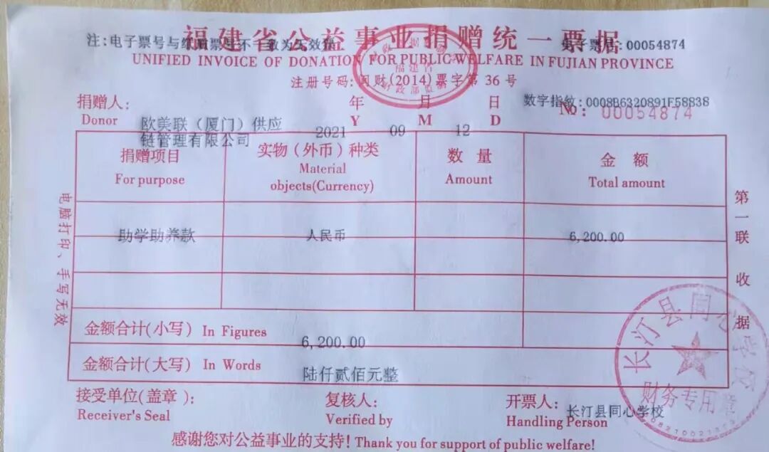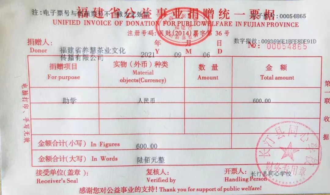 慈善捐赠总额为:600.00元,捐赠发票公示如下: