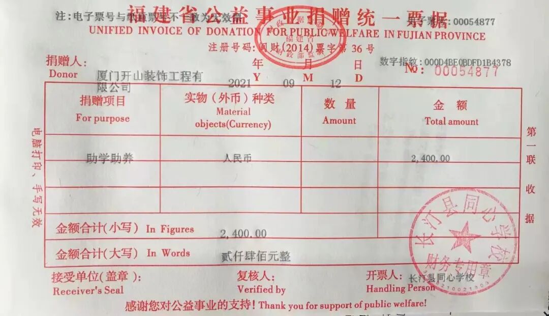 慈善捐赠总额为:2400.00元,捐赠发票公示如下: