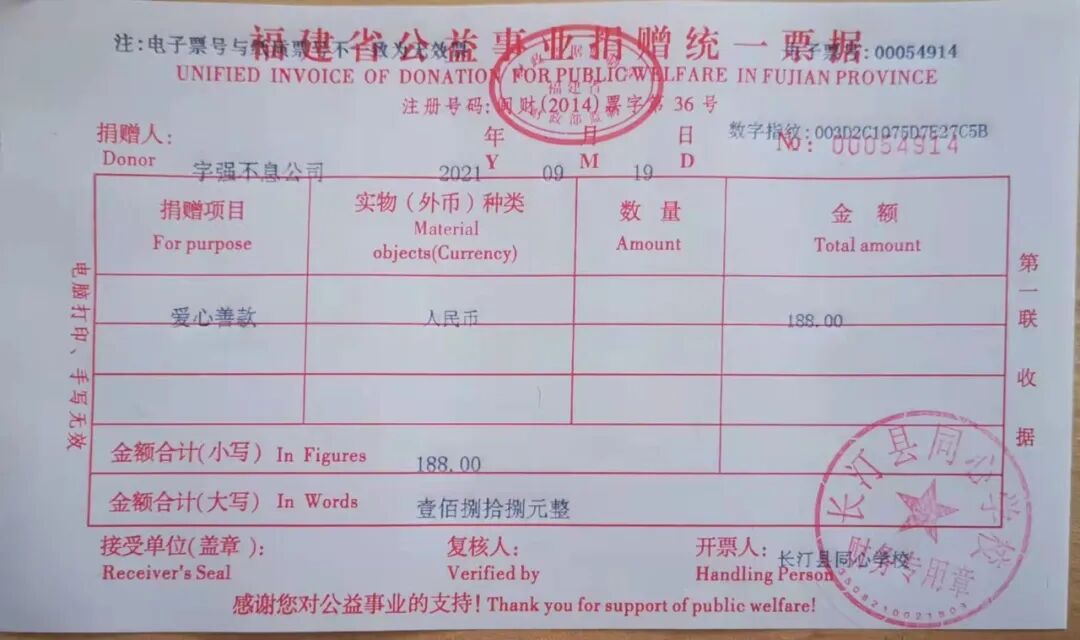 慈善捐赠总额为:188.00元,捐赠发票公示如下: