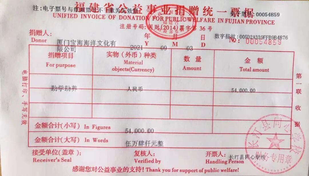 慈善捐赠总额为:54000.00元,捐赠发票公示如下: