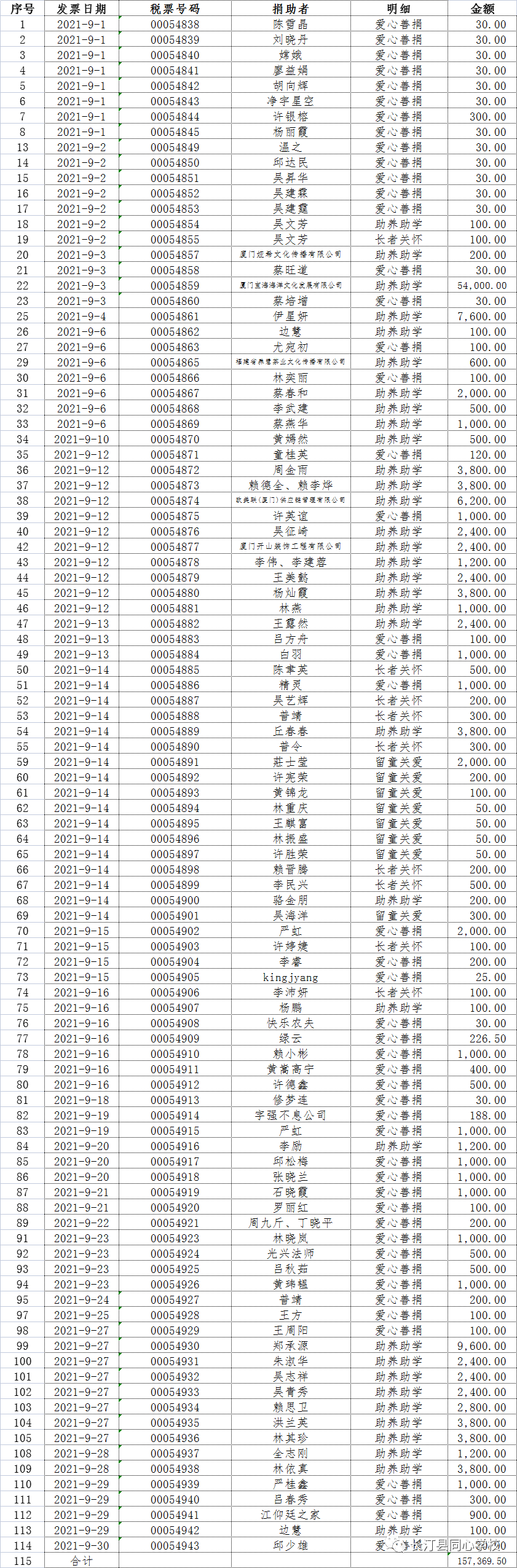 长汀县同心学校2021年9月捐赠公示如下: