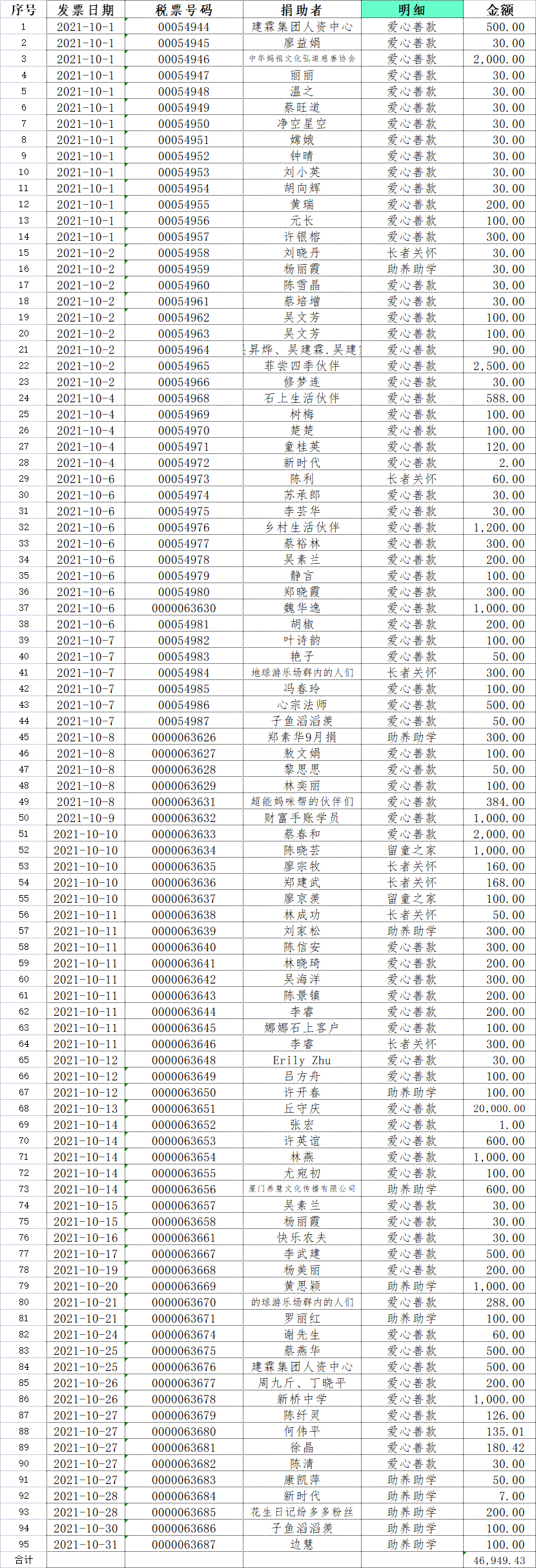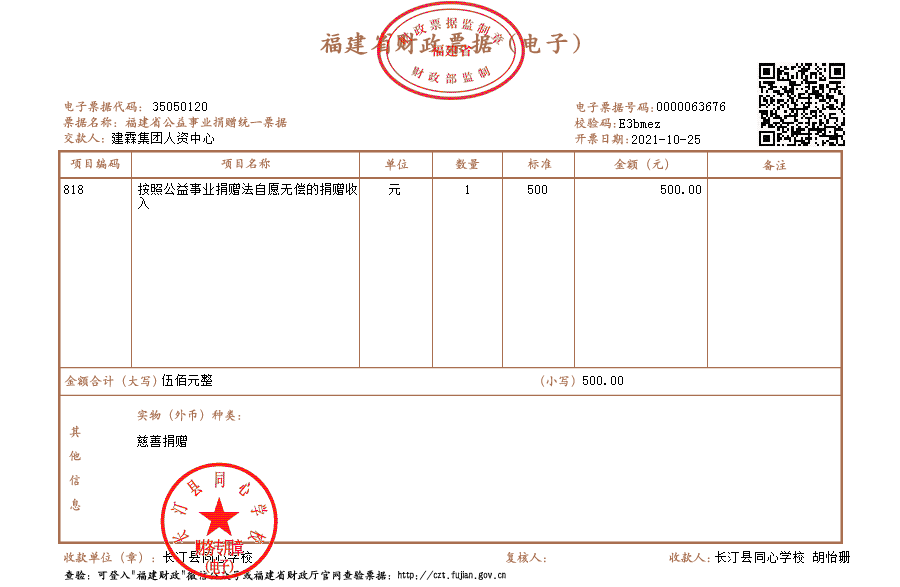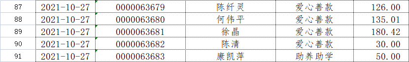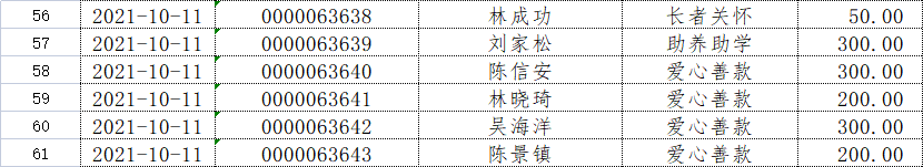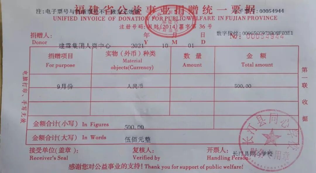 长汀县同心学校2021年10月捐赠公示如下: