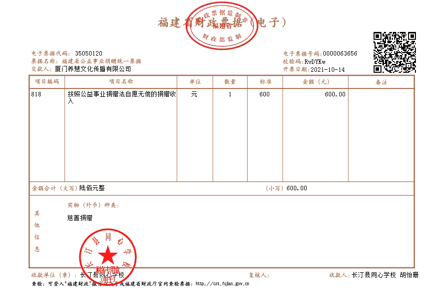 慈善捐赠总额为:600.00元,捐赠发票公示如下:
