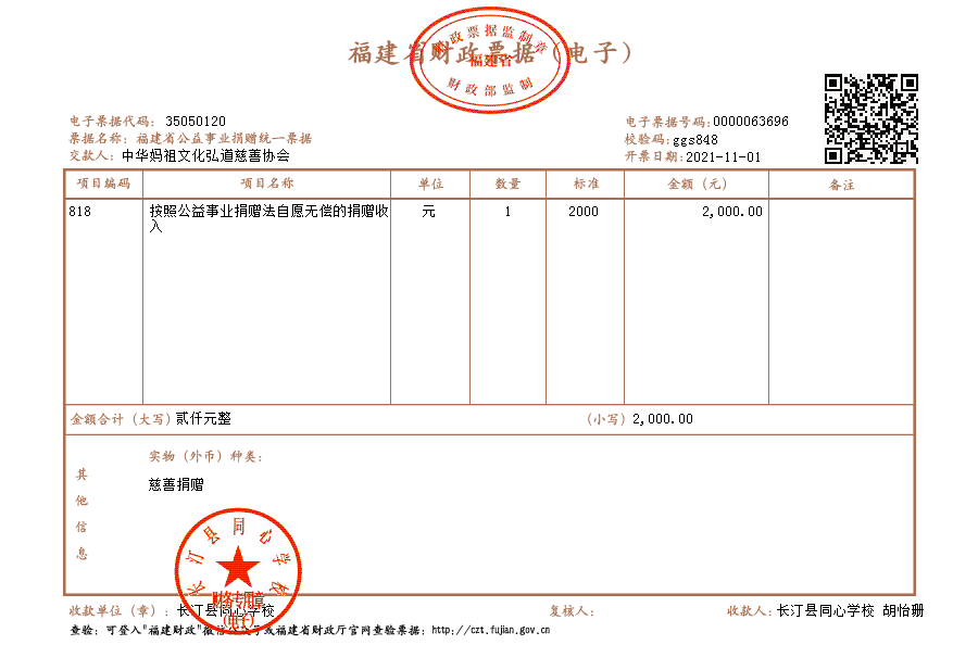 慈善捐赠总额为:2000.00元,捐赠发票公示如下: