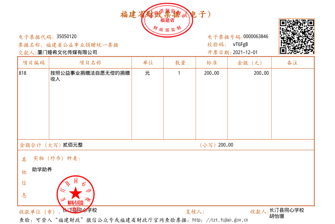 慈善捐赠总额为:200.00元,捐赠发票公示如下: