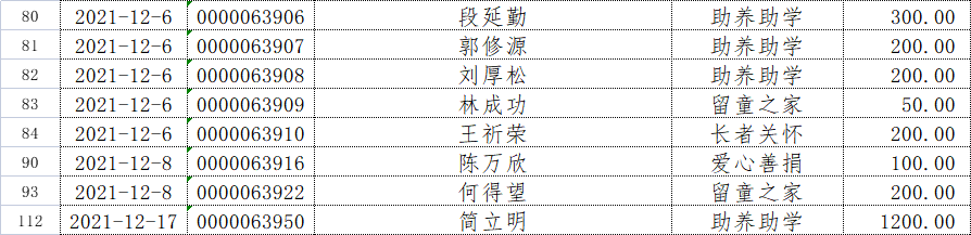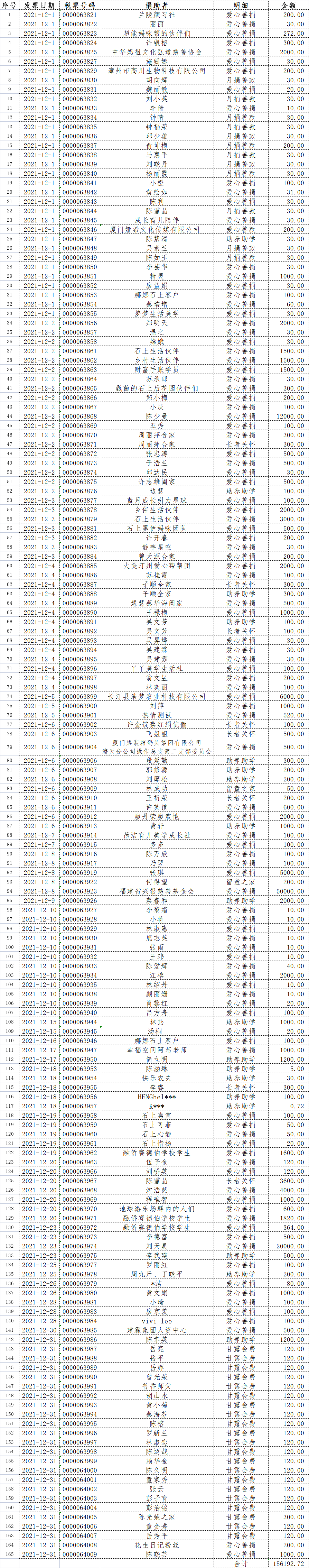 长汀县同心学校2021年12月捐赠公示如下: