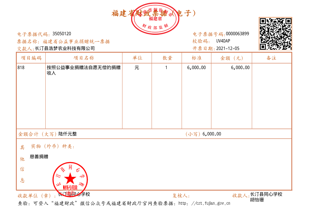慈善捐赠总额为:6000.00元,捐赠发票公示如下: