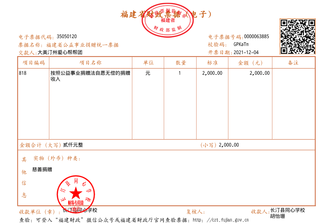 慈善捐赠总额为:2000.00元,捐赠发票公示如下:
