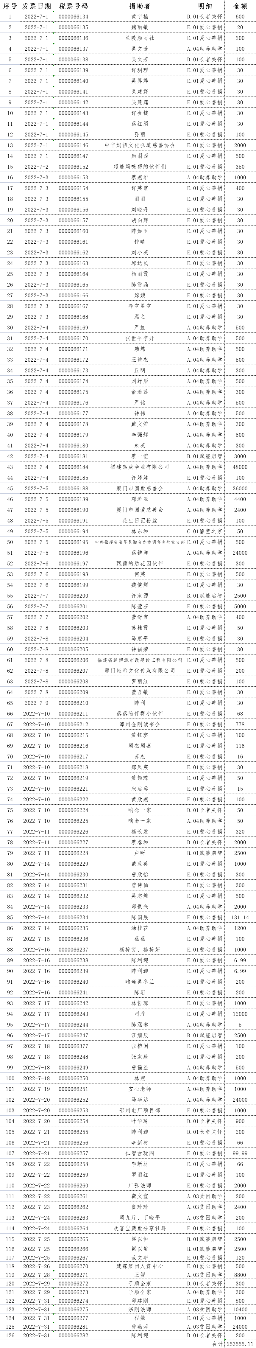 长汀县同心学校2022年07月捐赠公示如下: