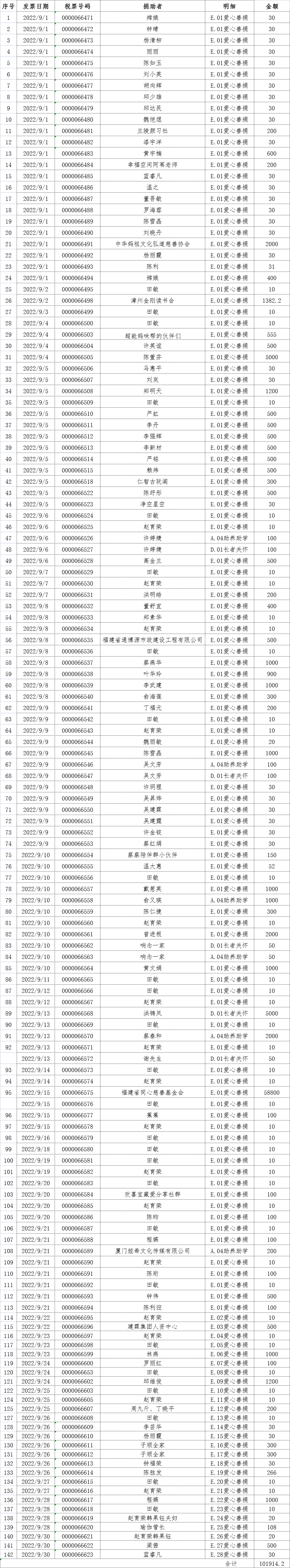 长汀县同心学校2022年09月捐赠公示如下: