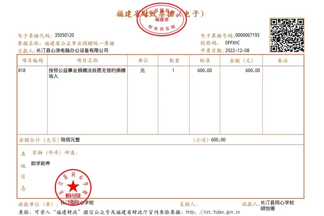 慈善捐赠总额为:600.00元,捐赠发票公示如下: