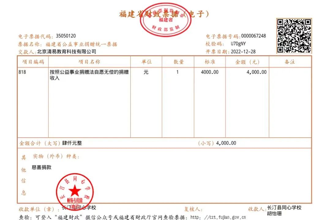 慈善捐赠总额为:4000.00元,捐赠发票公示如下: