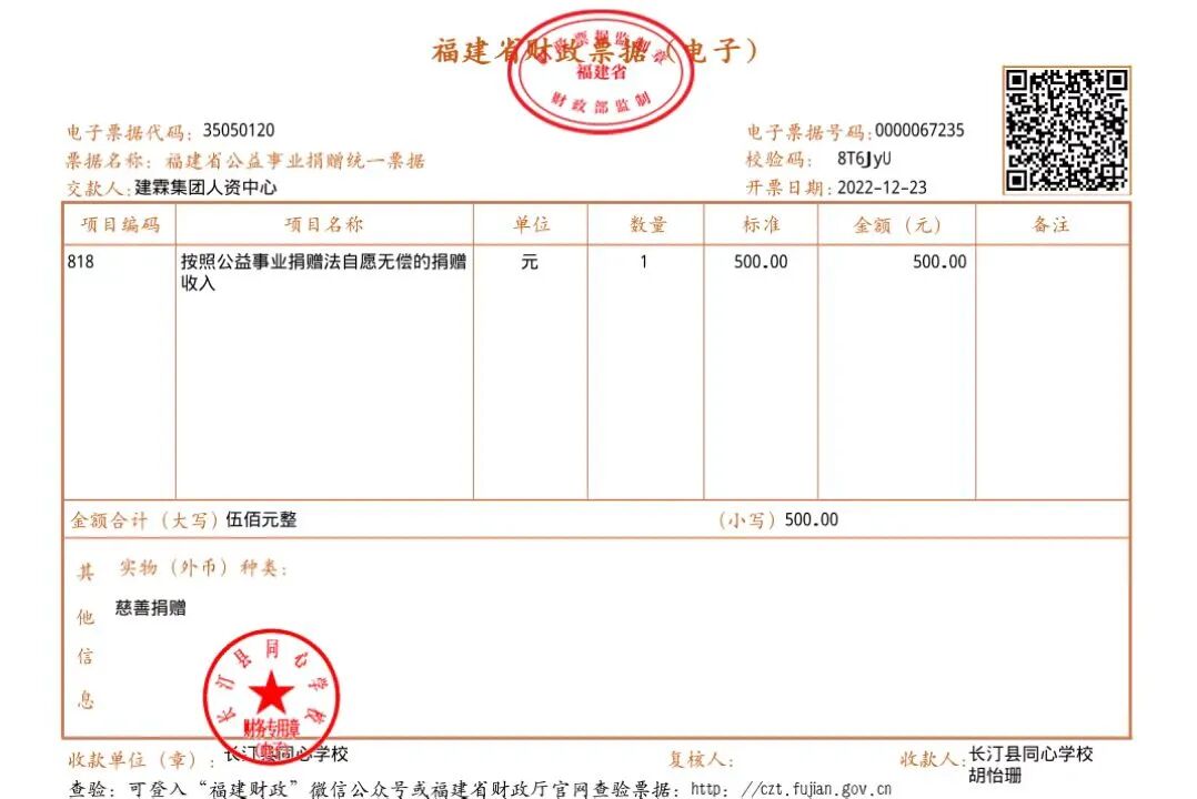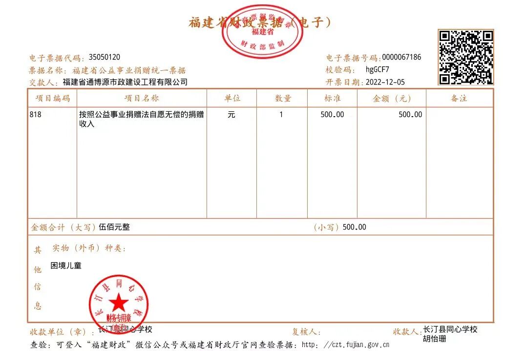慈善捐赠总额为:500.00元,捐赠发票公示如下: