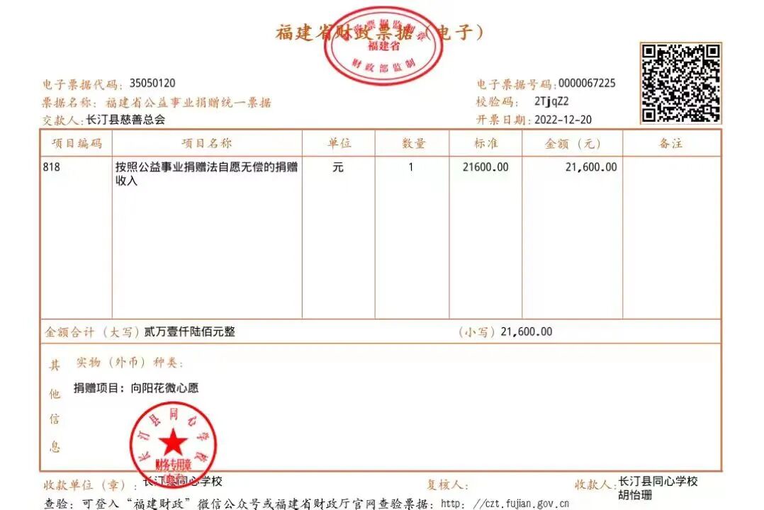 慈善捐赠总额为:21600.00元,捐赠发票公示如下: