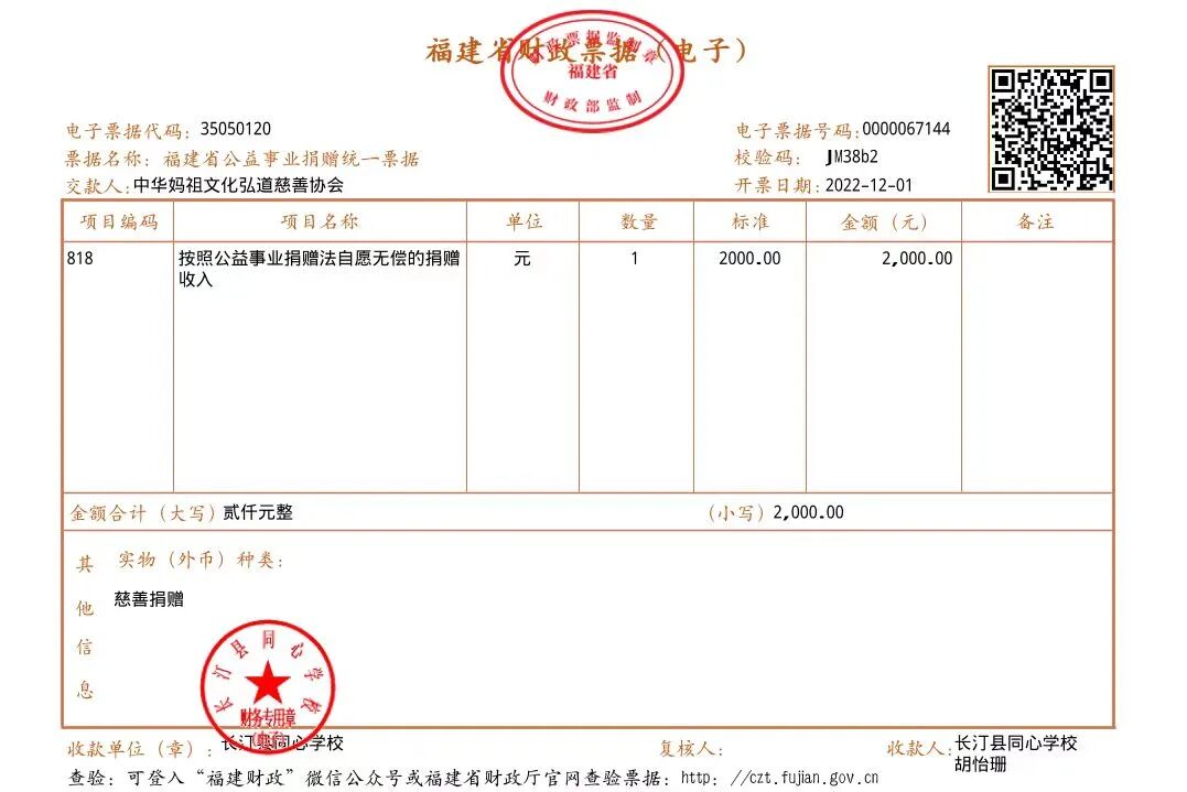 慈善捐赠总额为:2000.00元,捐赠发票公示如下:
