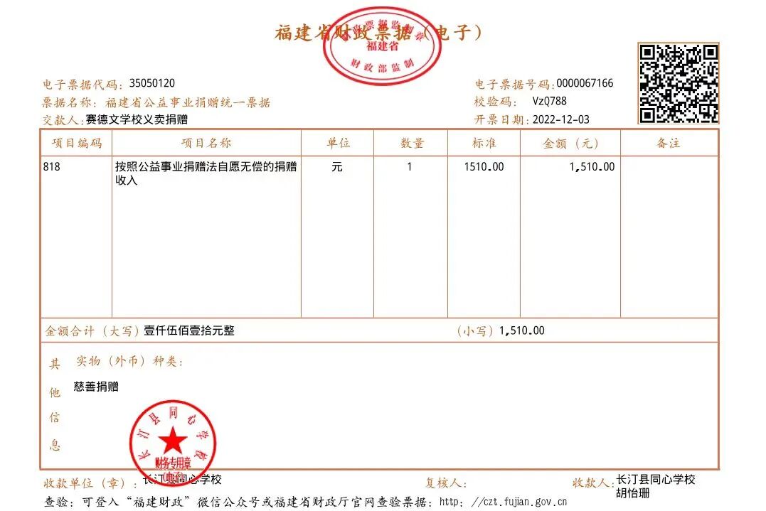 慈善捐赠总额为:1510.00元,捐赠发票公示如下: