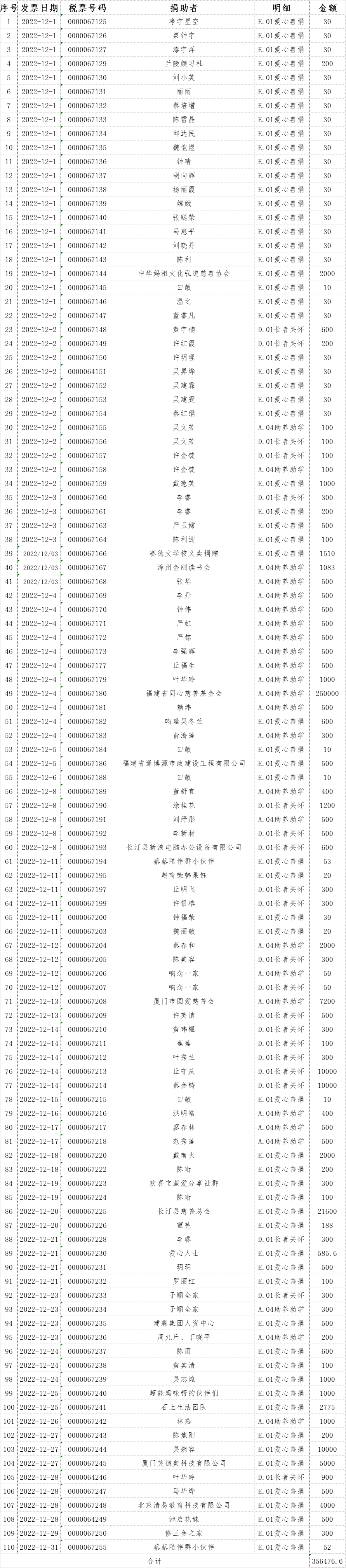 长汀县同心学校2022年12月捐赠公示如下: