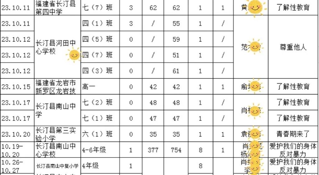 2023年10月,长汀县同心学校“绿伞”未成年人全面性教育志愿者讲师走进7所学校为共计约1534人次开展了25场公益课堂。