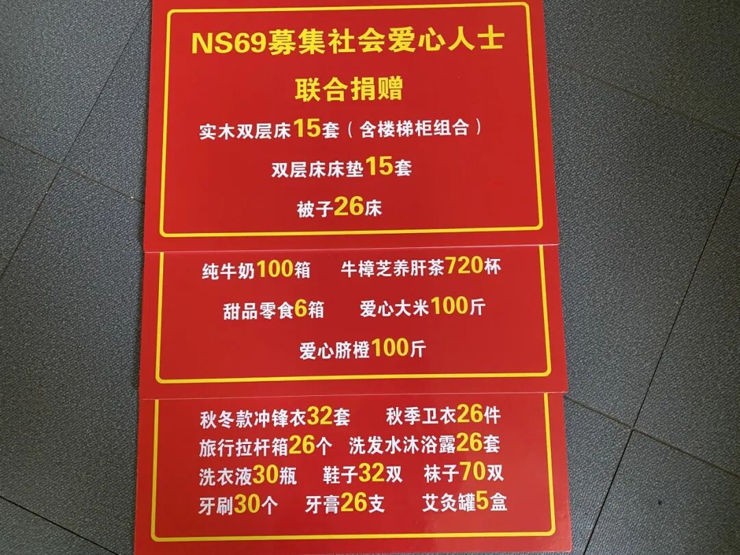 NS69团队募集社会爱心人士联合捐赠 实木双层床15套、双层床垫15套、被子26床、纯牛奶100箱、牛樟芝养肝茶720杯、甜品零食6箱、爱心大米100斤、爱心脐橙100斤、秋冬款冲锋衣32套、秋季卫衣26件、旅行拉杆箱26个、洗发水沐浴露26套、洗衣液30瓶、鞋子32双、袜子70双、牙刷30个、牙膏26支、艾灸罐5盒 。