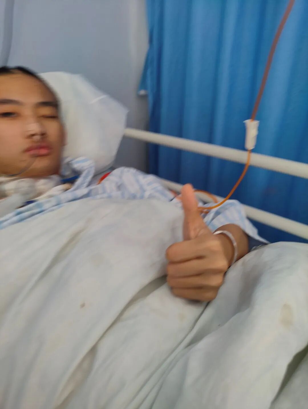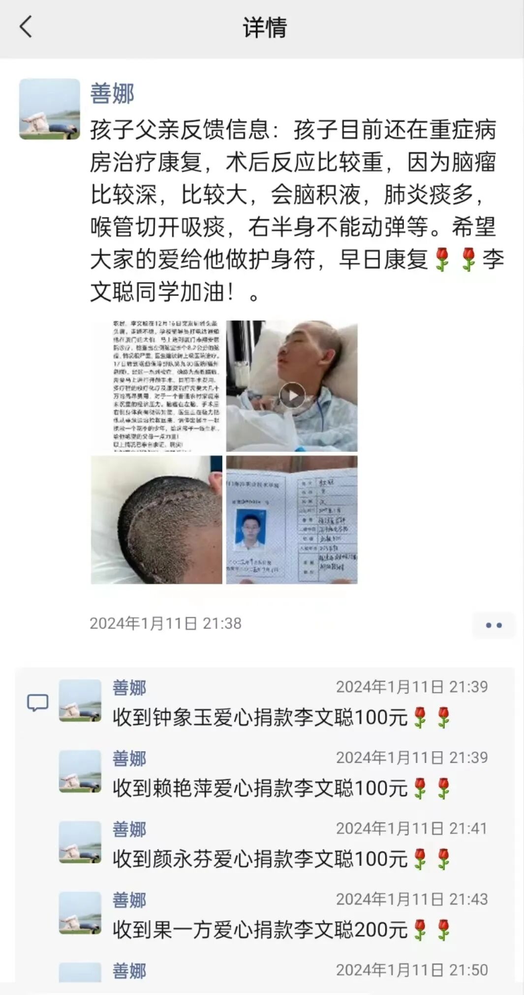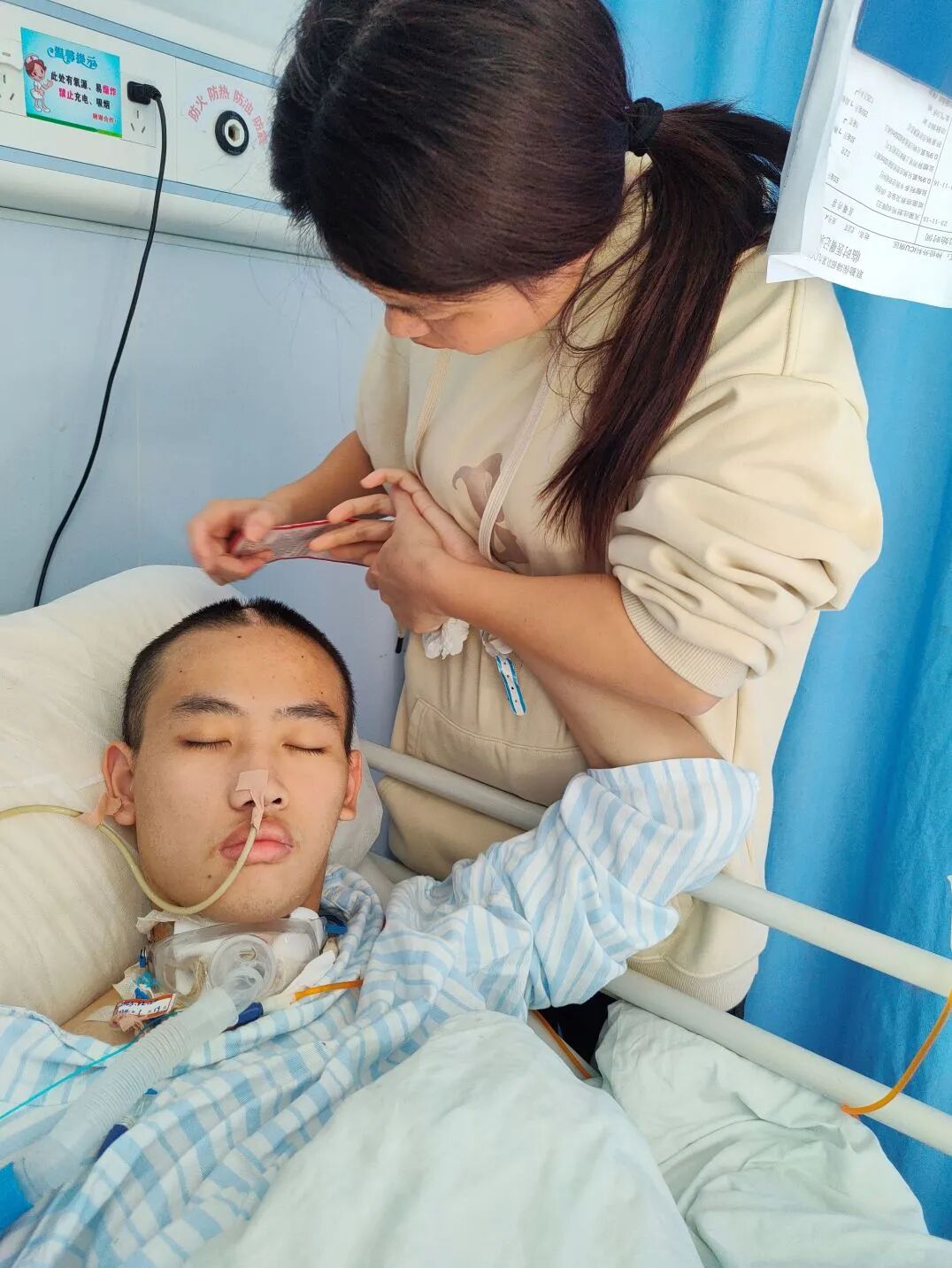 李妈妈在全程照顾陪护,因为治疗费用巨大及生活开支(而且家庭此前未购买相关保险,几乎要自费)爸爸先回去务工了,舅舅协助一起照顾。李同学历经两次大手术(脑部肿瘤切除,及肺炎喉管切开吸痰),在ICU呆了二十几天刚转到普通病房。身体右半边还只是轻微的知觉还动不了。妈妈提到,医护在ICU的照顾细心,孩子气色相对还好,但是在ICU期间孩子容易狂躁,燥起来就只能打镇定剂(看着心疼和担心不已,但ICU的情况家属是不能进入的)。现在度过危险时刻转普通病房,及妈妈和舅舅一直陪在身边,情绪缓和好多。