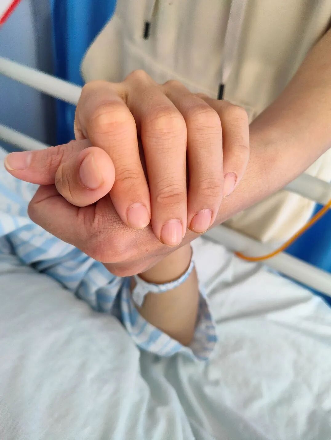 我和李同学妈妈交流过程中,李同学几次忍不住伸左手去抓头皮(脑部手术创口愈合过程中痒得难受),妈妈赶紧靠近拉着他的手说:“不能抓,我帮你摸一摸”,抚摸一会,妈妈的手又紧紧拉着孩子的手(避免他再伸手去抓,看到母子紧握的手,我还有另一个感受是,那是妈妈要紧握住孩子的手,用爱把孩子罩住啊)
