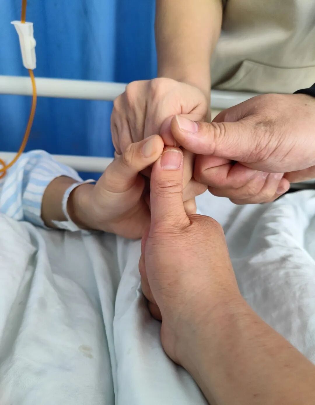 过程中,我在靠近李同学右侧,握着李同学的手和他问候祝福。李同学还无法发声,会偶尔来个小手势作回应。