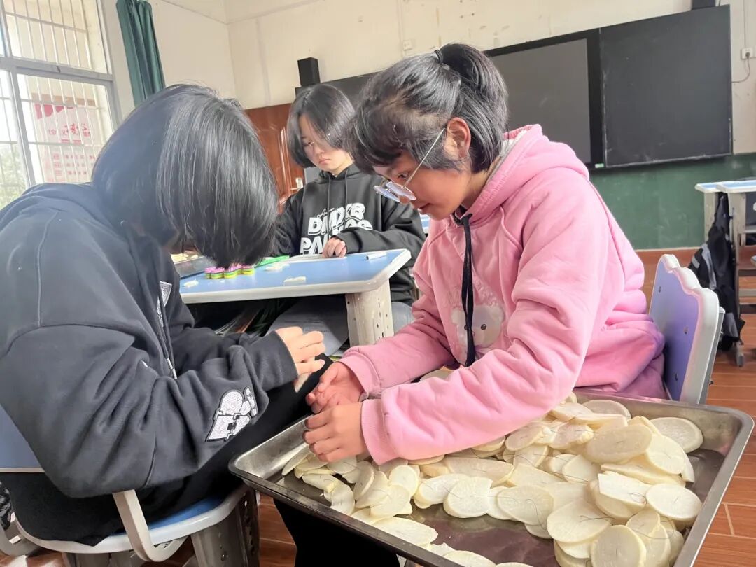 在田间劳作中体会种植的不易;在清洗中加强卫生保健知识;在备切中提高劳动技能;在晾晒中学会耐心等待。在制作萝卜干的过程中,看到萝卜一点一点风干,直至剩余精华部分,在组织孩子们参加生活劳动中,也让他们懂得“一分耕耘、一分收获”的道理。