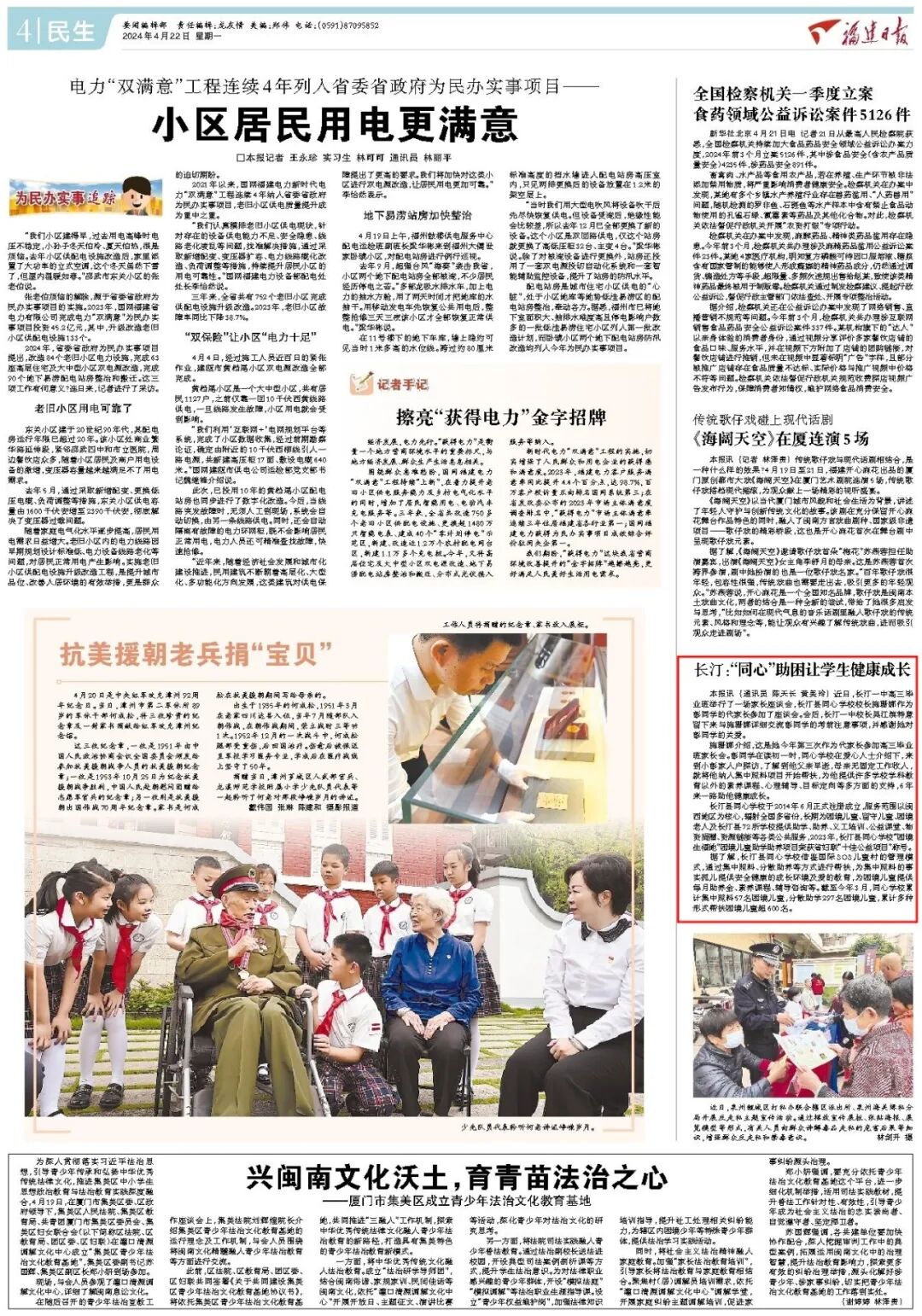 据了解,长汀县同心学校借鉴国际SOS儿童村的管理模式,通过集中照料、分散助养等方式进行帮扶,为集中照料的事实孤儿提供安全健康的成长环境及爱的教育,为困境儿童提供每月助养金、素养课程、辅导咨询等。截至今年3月,同心学校累计集中照料57名困境儿童,分散助学297名困境儿童,累计多种形式帮扶困境儿童超600名。